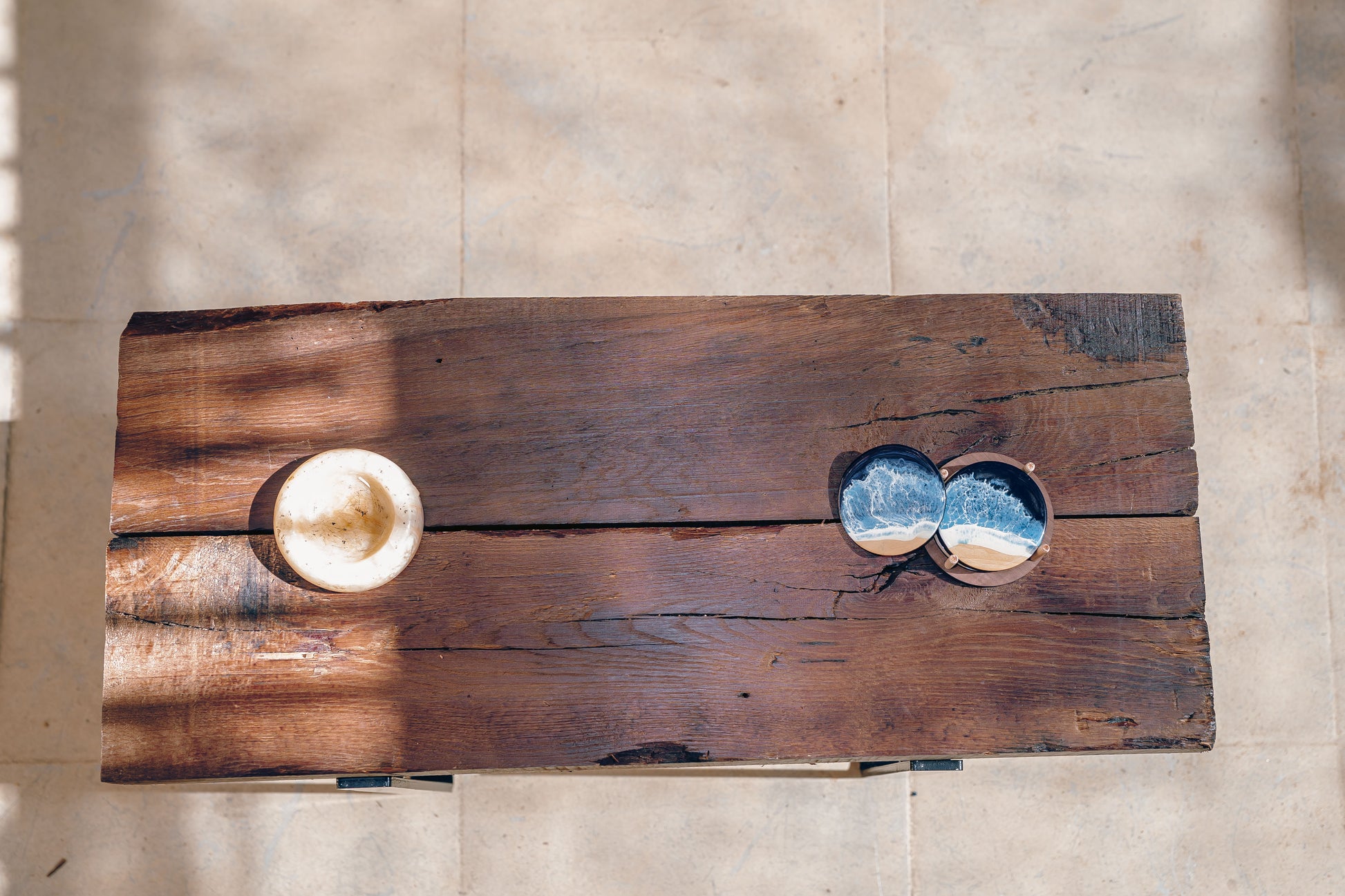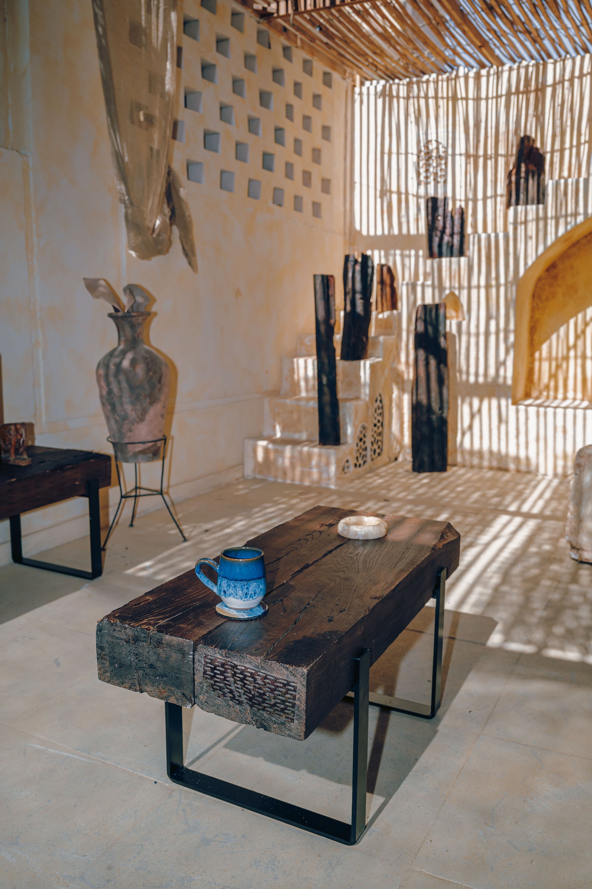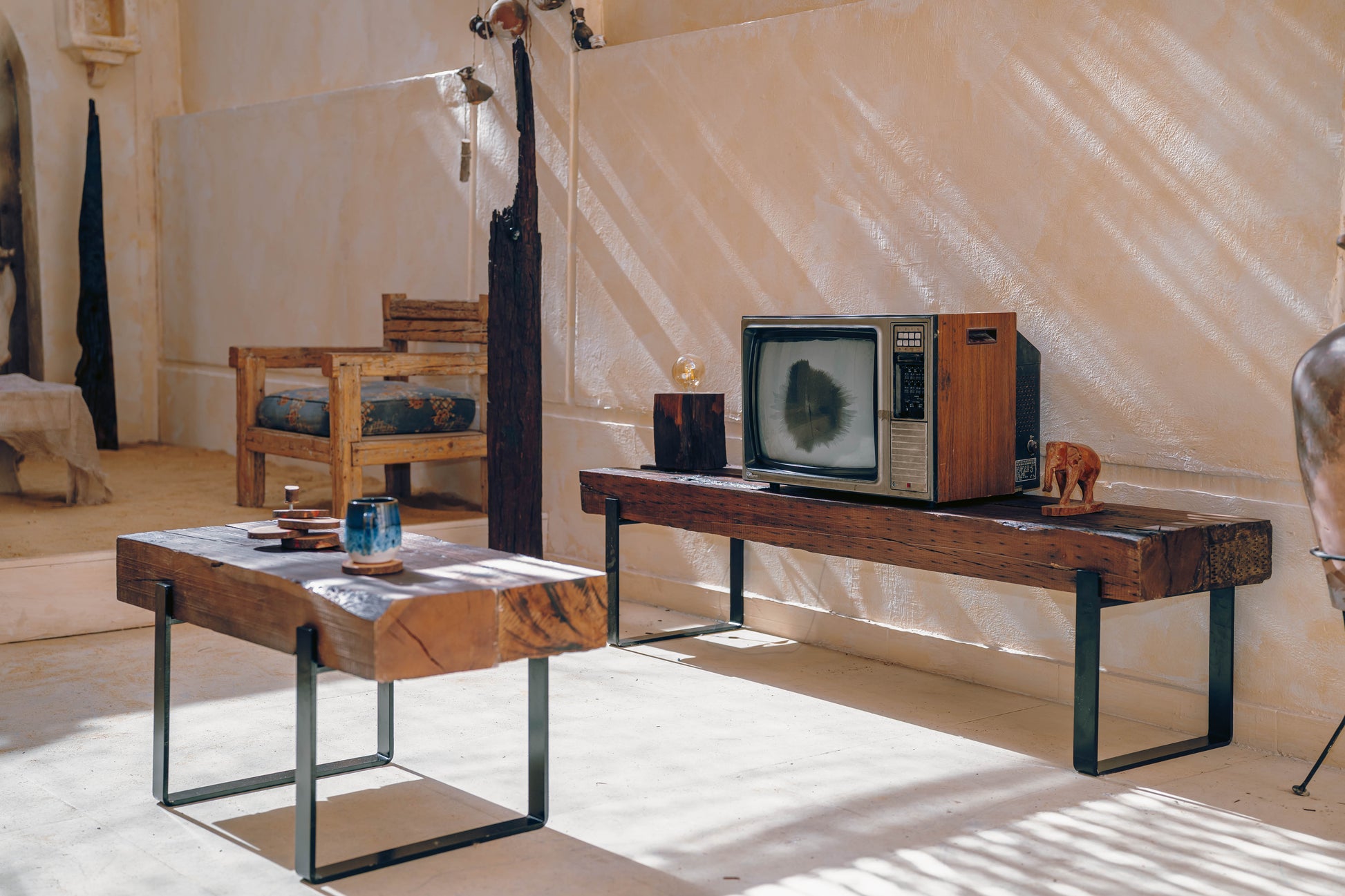 Bring the perfect blend of rustic charm and industrial strength into your home with this handcrafted coffee table, made from reclaimed oak wood and supported by sturdy iron legs. Each tabletop is shaped from salvaged oak—rich in character, grain, and natural imperfections—giving every piece its own story and unique appearance.